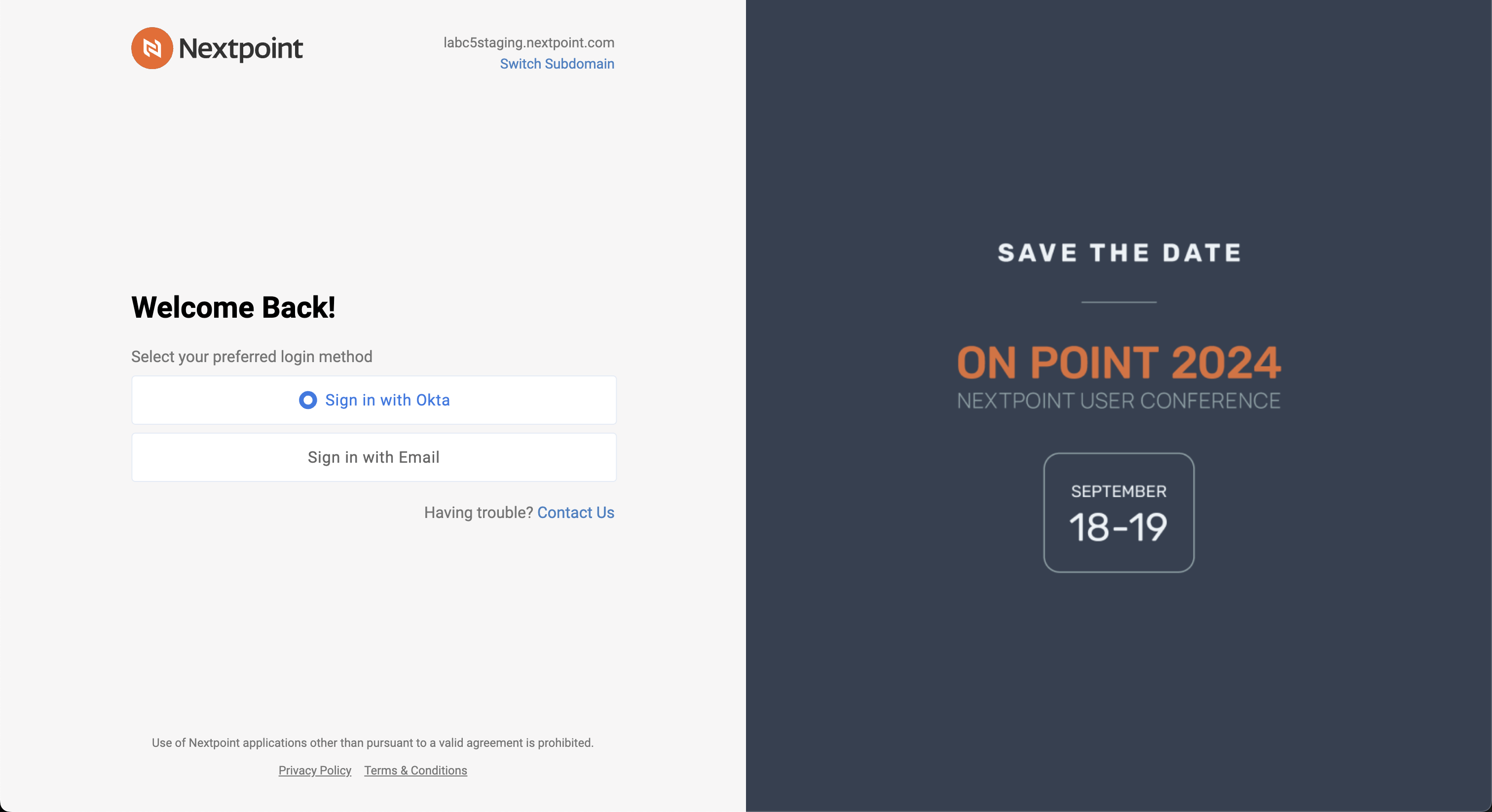 SSO also gives you the power to set security standards to meet the unique needs of your team. Your IT admin can easily manage user access for all your firm’s technology platforms in one space. All you need is an identity provider (IdP) like Azure or Okta, which can be seamlessly integrated with Nextpoint. Click here to learn more about Nextpoint security and SSO.