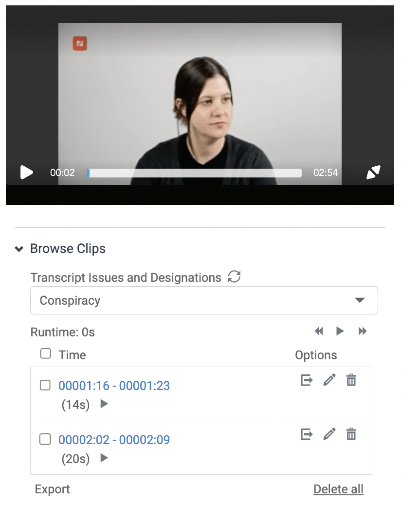 Once you’ve created designations in the transcript, you can click the “Browse Clips” dropdown and select a designation to view a list of them. You’ll also see a tiny “play” button next to each designation, which will play the video, covering just the lines selected in the designation. You can edit designations by clicking the pencil icon, or you can delete a designation by clicking the trash can icon.