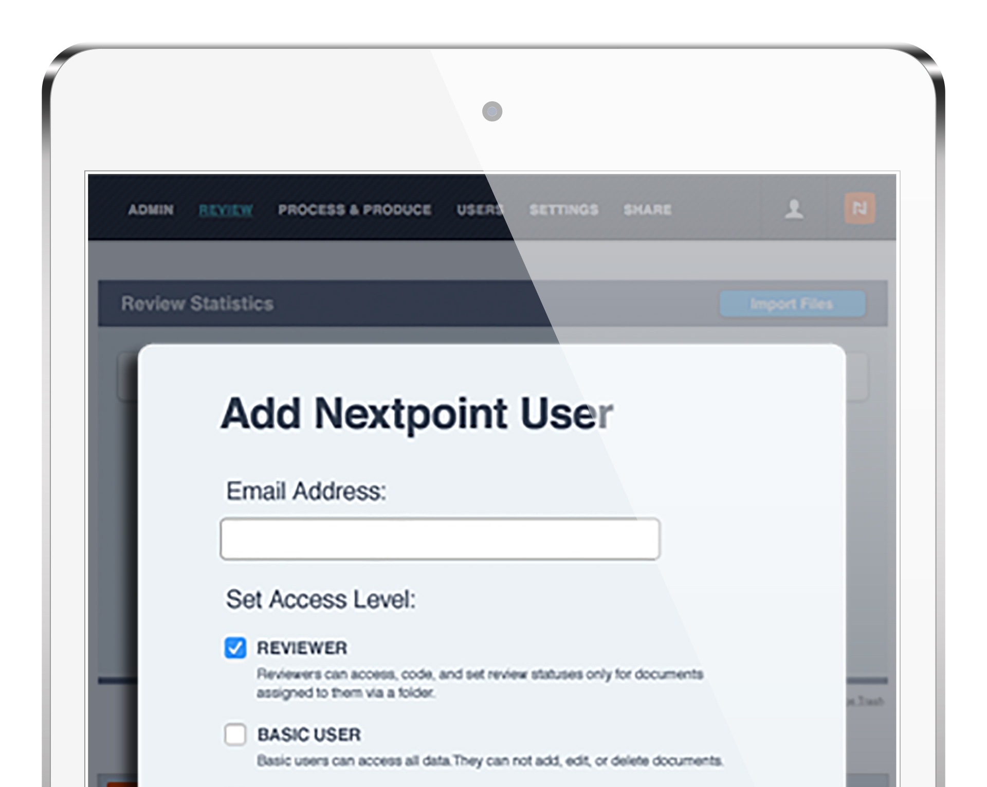 Access to data is permissions-based. Four distinct “clearance” levels assigned to users based on role—mean you control who can access data at the case, folder and document level.